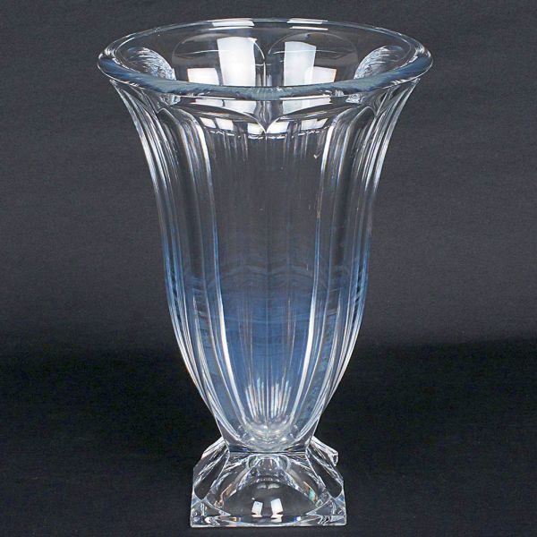 • <b>Vaso </b>em cristal lapidado, de corpo cilíndrico levemente afunilado, decorado por gomos verticais. Borda superior espessa e boleada, apoiado sobre base quadrada facetada. Apresenta lascados nos cantos da base. Alt. 36 cm