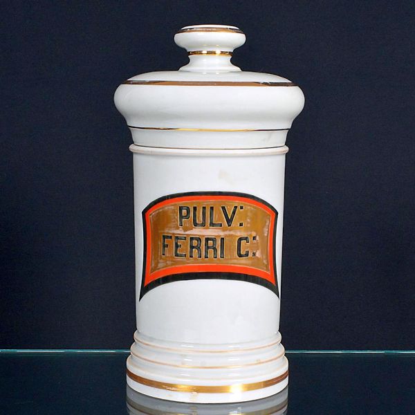• <b>Pote de farmácia </b>em porcelana branca, com corpo cilíndrico e detalhes em filetes dourados. Cartela frontal pintada nas cores vermelho, dourado e preto com inscrição "PULV: FERRI C:". Apresenta restauro na tampa.