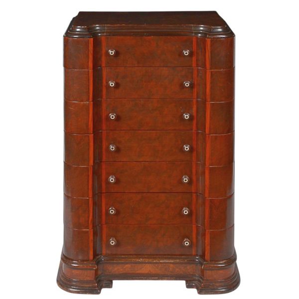 • "<b>Semanier</b>" em madeira nobre, de linhas curvas, com sete gavetas frontais dotadas de puxadores torneados em madeira com detalhe central. Cantos arredondados e base com molduras escalonadas. Med. 107 x 64 x 40 cm
