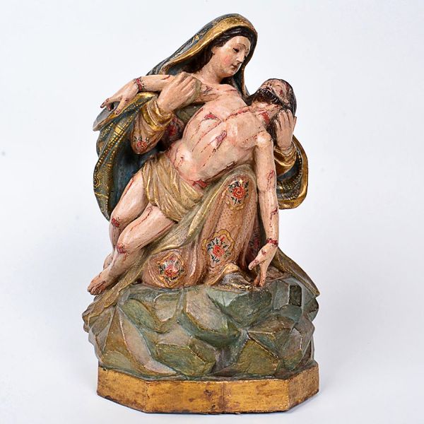 • Belíssima imagem da <B>Pietá</B> em madeira entalhada, tendo as vestes da Nossa Senhora requintada policromia florida em carmim sobre fundo azul e douração de erudição plena. Pernambuco. Séc. XVIII. Alt. 36,5 cm