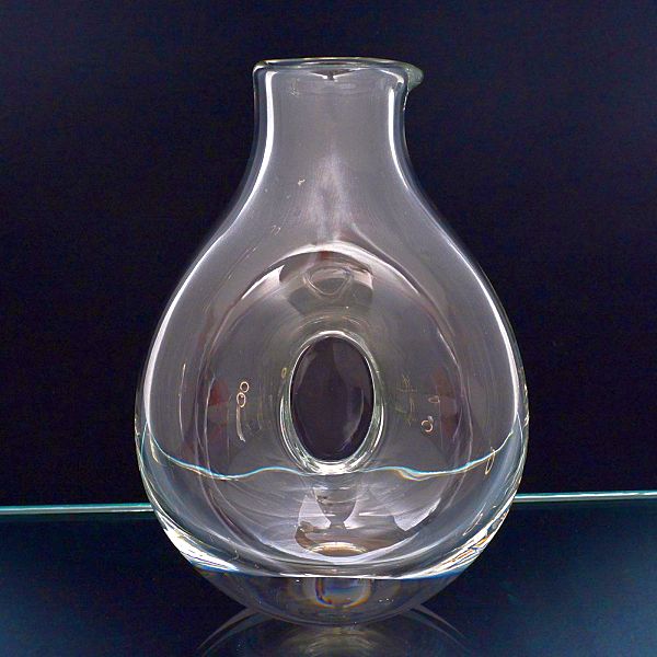 • <b>Decanter </b>em cristal, de corpo bojudo, com recorte vazado central emoldurado pelo próprio vidro, formando detalhe ovalado. Bico levemente assimétrico.