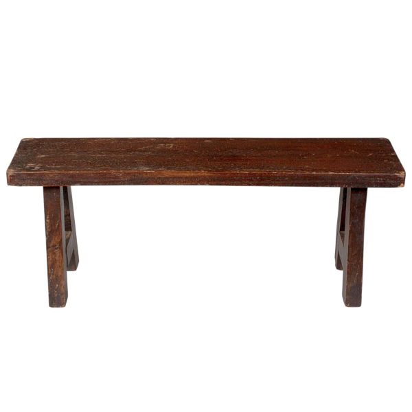 • <b>Banco </b>em madeira maciça, de linhas simples e estrutura retangular, apoiado sobre pés laterais em forma de cavalete. Med. 47 x 120 x 29 cm