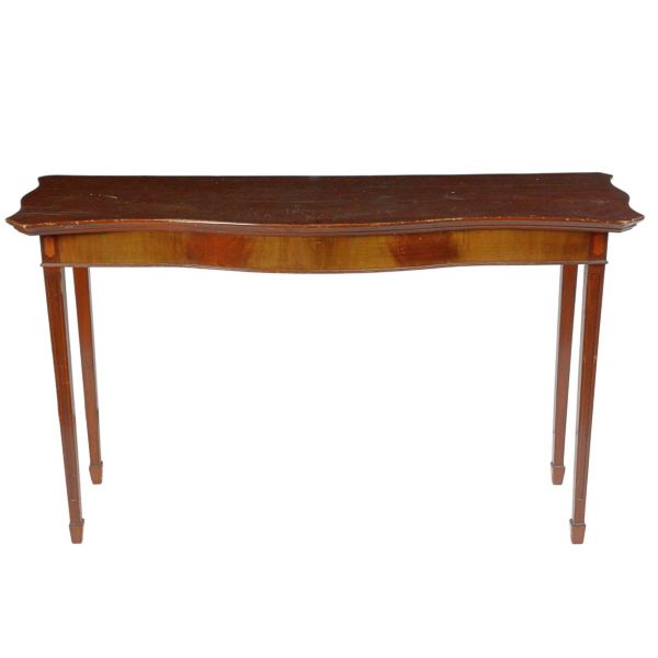 • <b>Console com tampo </b>recortado e laterais lisas. Pés retos com detalhes embutidos. Apresenta desgastes. Med. 80 x 135 x 43 cm