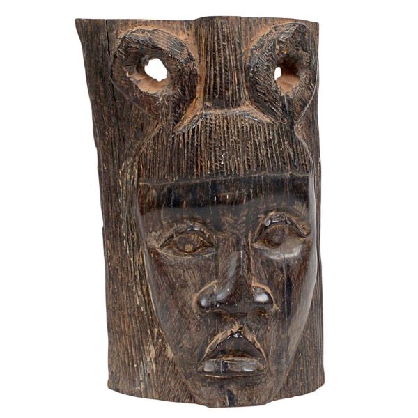 • <b>Máscara africana </b>entalhada em madeira escura, representando rosto humano estilizado com chifres duplos no topo. Alt. 32 cm