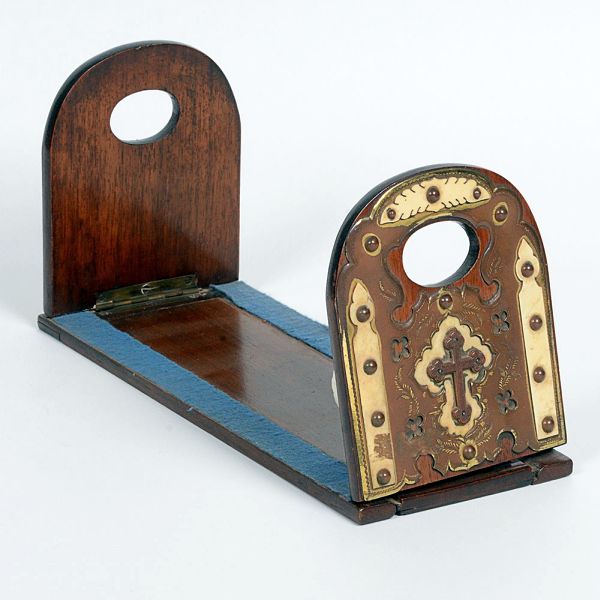 • <b>Aparador de livros</b>  em madeira com aplicações de motivos cruciformes. Compr. 32 cm
