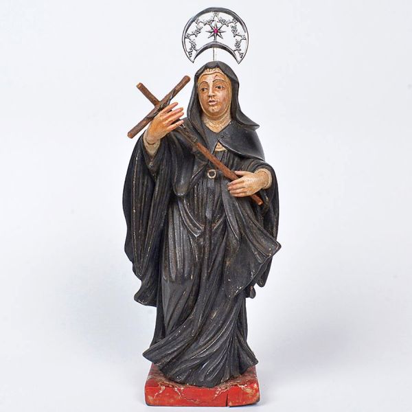 • Belíssima imagem de <b>Santa Rita </b>em madeira entalhada, de excelente erudição. Vestes profusamente plissadas. Pintura íntegra. Base marmorizada em vermelho e carmim. Resplendor de prata em formato de meia lua centralizando estrela com pedra vermelha. Séc. XVIII. Alt. 29 cm