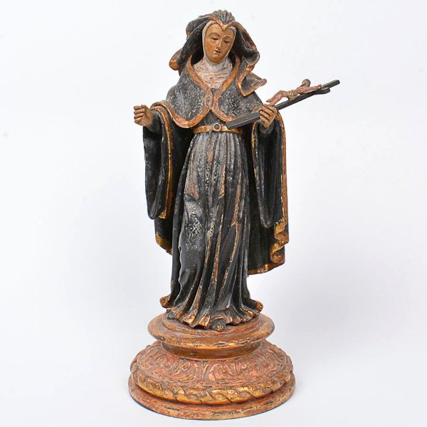 • Belíssima imagem de <b>Santa Rita </b>de concepção fortemente erudita, apresentando vestes plissadas e policromadas, com douração de época. Pano da cabeça movimentado. À mão esquerda o crucifixo. Base circular lavrada. Séc. XVIII. Alt. 31 cm