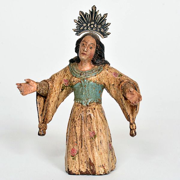 • Imagem de <b>Nossa Senhora </b>em madeira entalhada e policromada, representada de braços abertos em atitude acolhedora. Porta resplendor em prata. Policromia com craquelê acentuado e marcas do tempo. Alt. 12 cm
