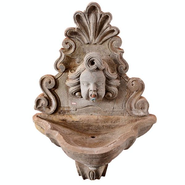 • Fonte de parede em pedra esculpida com espaldar ornamentado por volutas e grande concha superior, tendo ao centro máscara de querubim atuando como bica. Pia de borda sinuosa. Séc. XX. Med. 110 x 75 cm