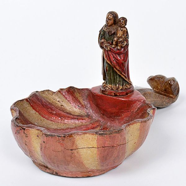 • Invulgar <b>concha batismal </b>em madeira entalhada em rica policromia íntegra, destacando-se uma imagem de Nossa Senhora em composição ao conjunto. Pega terminada em elemento enrolado. Compr. 24 cm