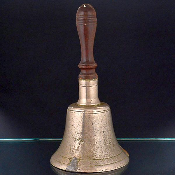 • <b>Sino </b>eclesiástico em prata com cabo em madeira torneada.