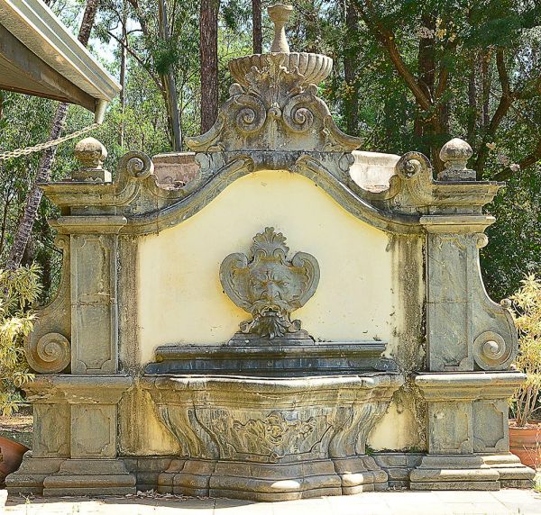• <b>Fonte monumental </b>em pedra lavrada, de inspiração barroca, composta por grande painel recortado com volutas laterais e coroamento em bacia superior. Ao centro, carranca em alto-relevo verte água para ampla bacia sinuosa inferior, ricamente ornada com motivos fitomórficos. Compr. total 396 cm