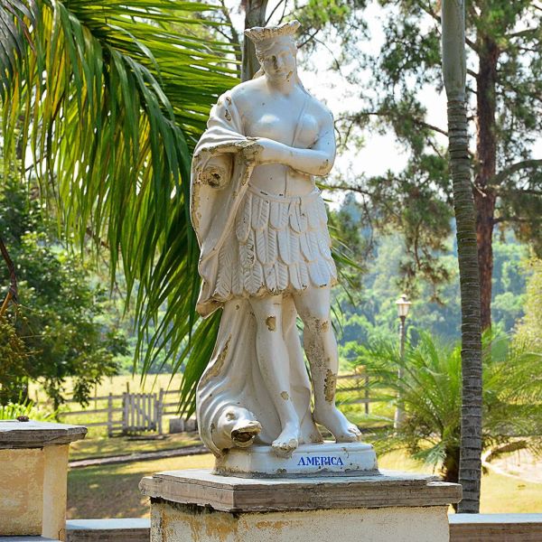 • <b>Escultura </b>em faiança vitrificada, representando figura alegórica de "América", em pé, portando cocar e saia estilizada em formato de folhas, com peleja enrolada ao redor do corpo, apoiada sobre golfinho. Inscrições "Fª S?? Antônio  Porto". Apresenta desgastes e pequenas perdas no esmalte.