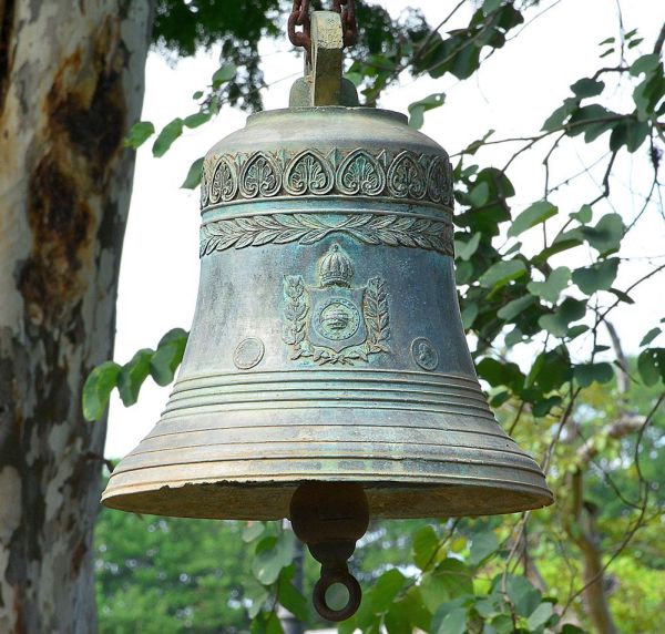 • Raro <b>sino em bronze</b>, encimado por brasão do Império do Brasil, ricamente ornamentado em alto-relevo com coroa imperial, ramos de louro e medalhões laterais com efigies, de Dom Pedro II. Apresenta ainda inscrição em medalhão com os dizeres "Prêmio Conferido na Exposição Nacional de 1861".