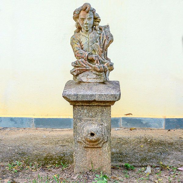 • <b>Escultura em pedra </b>entalhada, representando figura masculina jovem trajando vestes de época, apoiada sobre base cilíndrica com orifício frontal que sugere antigo uso como bica ou chafariz. Alt. 130 cm