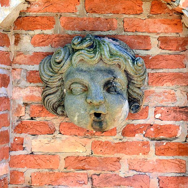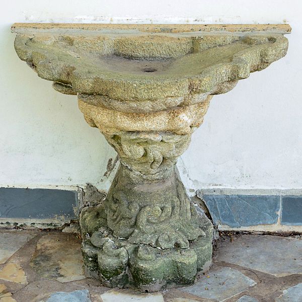 • <b>Par de talhas </b>esculpidas em pedra, no formato de cabeça de anjo, com traços delicados e cabelos em mechas onduladas. Boca levemente aberta, sugerindo antigo uso como bica de chafariz.