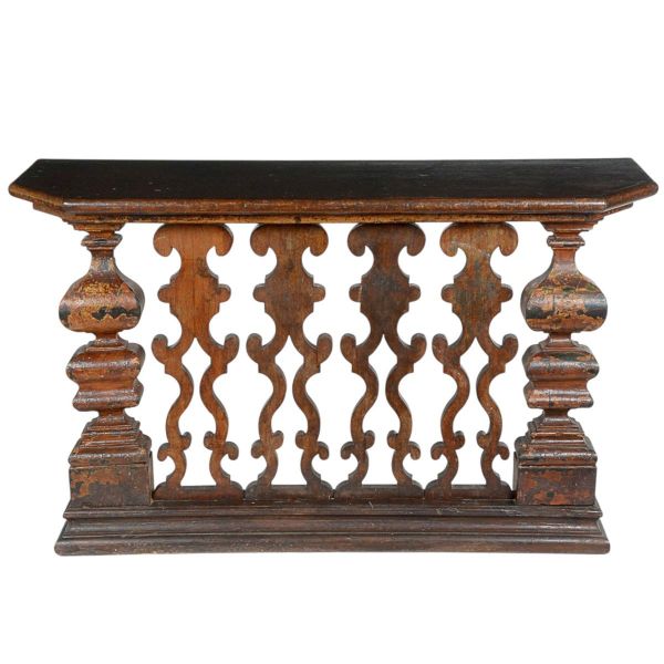 • <b>Balaustrada </b>em madeira entalhada, com tampo retangular de cantos chanfrados apoiado sobre estrutura frontal torneada e elementos vazados em volutas simétricas. Med. 90 x 153 x 43 cm