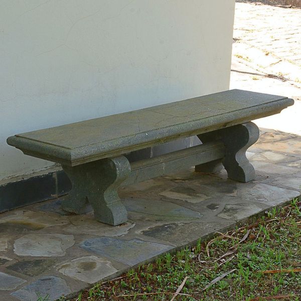 • <b>Banco </b>em pedra, com assento retangular liso e bordas boleadas, apoiado sobre dois pés em formato de voluta ligados por travessa central. Apresenta pequenas rachaduras no assento.