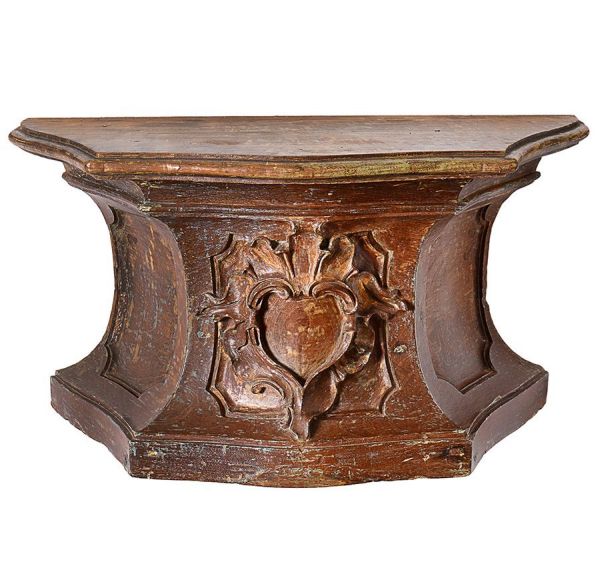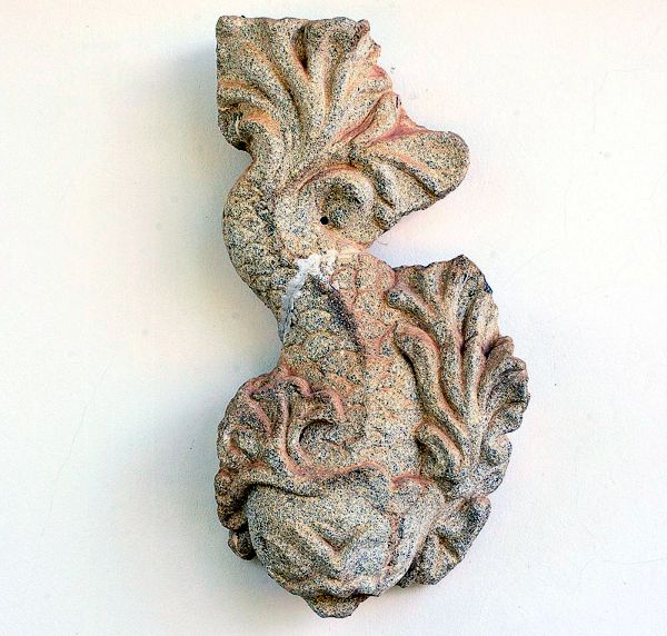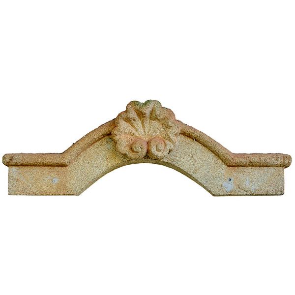 • <b>Talha</b>  decorativa em pedra, em formato de frontão arqueado com elemento central entalhado em volutas e acantos.