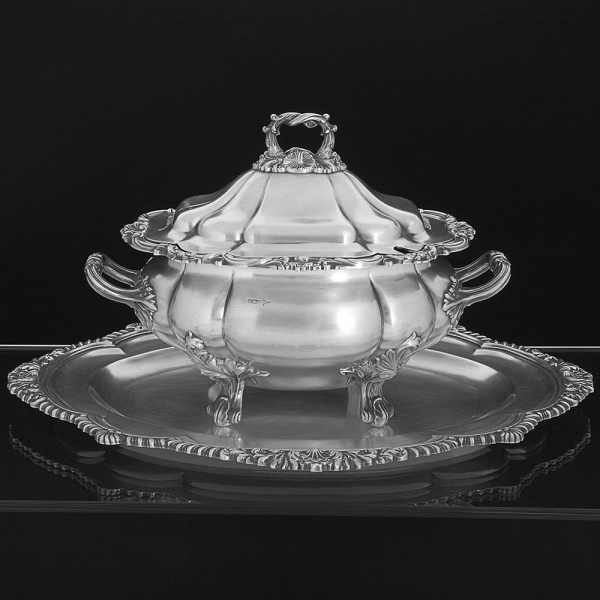 • <B>Sopeira </B>em prata inglesa de forma oblonga. Apresenta bojo e tampa gomados, pega e pés em repuxados e cinzelados com elementos fitomorfos e "coquilles". Contraste da cidade de Sheffield de 1909 e marca do prateiro Walker & Hall. Acompanha "presentoir" do período George III, de borda ondulada com decoração muito similar. Contraste da cidade de Londres de 1796 e marca de prateiro. Compr. Da sopeira 37,5 cm; Compr. do "presentoir" 54 cm. Peso 5010 gramas.