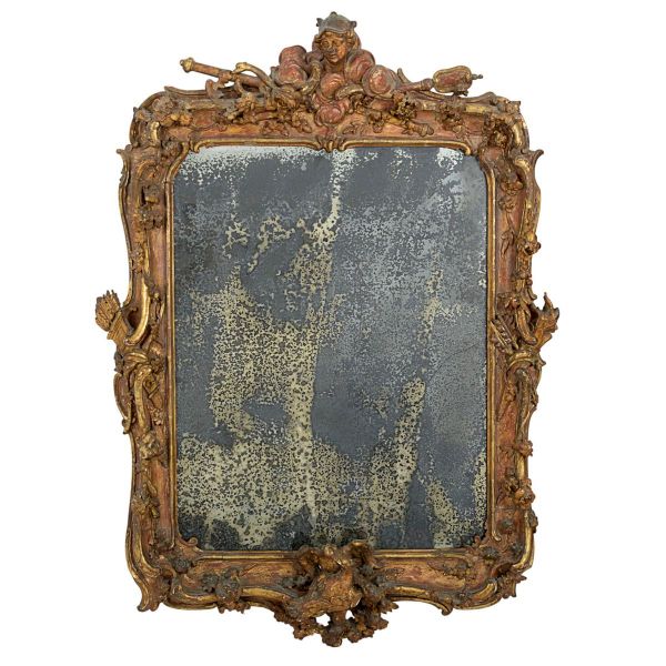 • Magnífico <B>espelho </B>francês Louis XV com moldura ricamente entalhada e dourada, apresentando ao topo cabeça de jovem, provavelmente o deus Hermes, filho de Zeus e Maia, entre esparramados de flores. Laterais com aljavas com flechas e pombinhos enamorados na parte inferior. Trata-se de uma alegoria ao amor. Espelho azinhavrado conferindo sofisticação ao conjunto. Séc. XVIII. Med. 125 x 92 cm