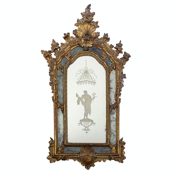 • Belíssimo <B>espelho </B>europeu, provavelmente italiano, emoldurado em madeira lindamente entalhada e dourada em elementos barrocos com volutas, florões e guirlandas recamando suas laterais. Ao centro a figura de Esculápio, deus da medicina na mitologia romana, sob baldaquim. Parte inferior do florão colada. Séc. XVIII. Med. 98 x 52 cm