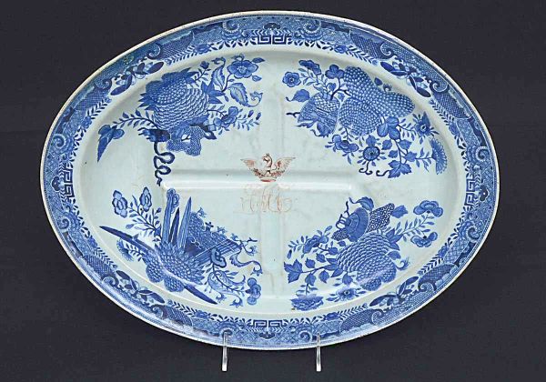 • <B>Travessa </B>oval para assados em porcelana Companhia das Índias decorada em azul índigo no padrão "Fitzhugh" feito de encomenda para o mercado americano. Ao centro monograma sob timbre. Início do séc. XIX. Med. 44,5 x 34 cm