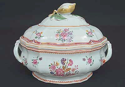 • <B>Sopeira </B>de forma oblonga, ao gosto das peças de Meissen, decorada em rica policromia florida predominando tonalidade de rosa e violeta. Pega da tampa modelada em fruto e realces a ouro. Séc. XVIII. Compr. 33 cm