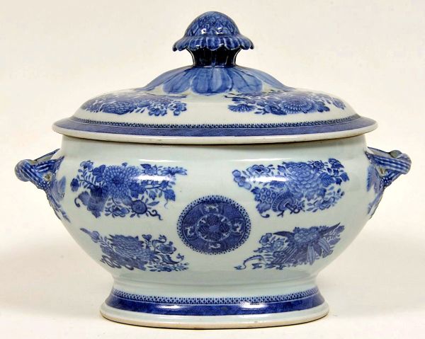 • <B>Sopeira</B>  oblonga em porcelana Companhia das Índias decorada em azul índigo "underglaze", no padrão "Fitzhugh". Pegas do bojo entrelaçadas e da tampa em modelado de pinha. Período Jiaqing. Compr. 35 cm