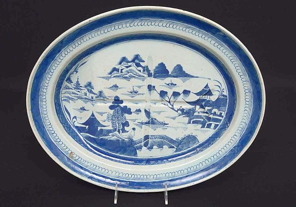 • <B>Travessa </B>oval para assados em porcelana chinesa do séc. XVIII, decorada em azul índigo "underglaze" com paisagem lacustre e casario. Borda em arabescos. Séc. XVIII. Med. 41,5 x 34 cm
