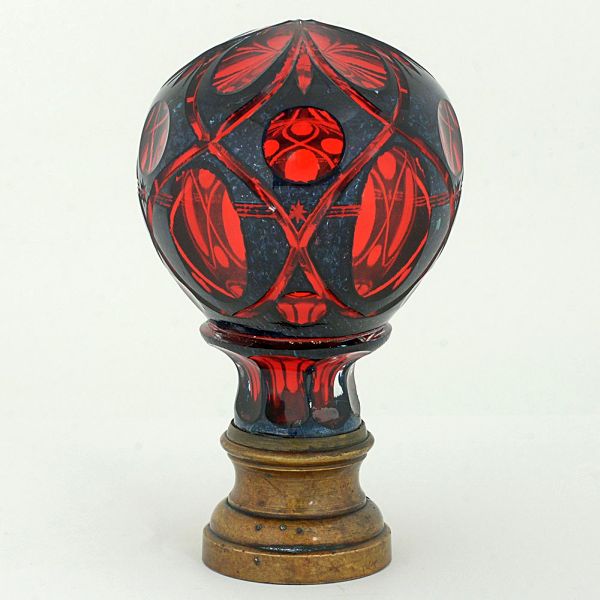 • <B>Pinha </B>globular francesa em cristal rubi com "overlay" em negro. Lapidada com estilizações. Base em bronze. Séc. XIX. Alt. 18 cm
