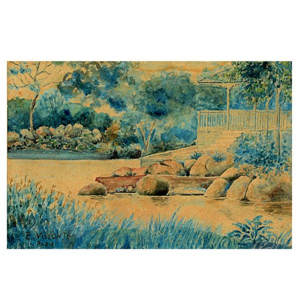 • <B>VISCONTI, ELISEU</B><BR>(1866-1944)<BR>Paisagem<BR>Aquarela s/ papel<BR>Ass. e situado Paris, cie<BR>16 x 23 cm