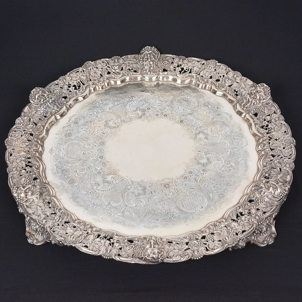 • Extraordinária e <B>grande salva </B>em prata inglesa de forma circular, repuxada e cinzelada. Fundo com flores, volutas, reservas com escamados e texturizados. Centro liso. Borda em requintado trabalho de repuxados e cinzelados com máscaras bacantes e composições com flores, cachos de uvas e folhas de parreira. Os quatro pés seguem o mesmo estilo. Contraste da cidade de Londres de 1847 e marca ilegível de prateiro. Diâm. 64 cm. Peso 6295 gramas.