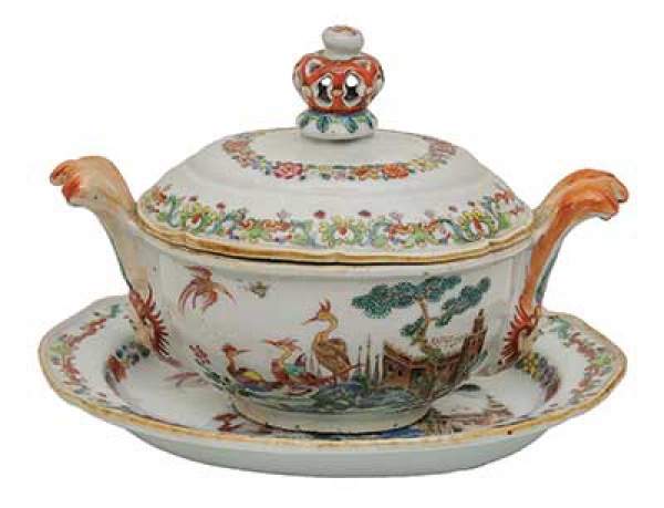 • <B>Sopeira miniatura com seu "presentoir" </B>em porcelana Companhia das Índias decorada em policromia nos esmaltes da Família Rosa com figuras e aves entre paisagem com edificações. Restante das peças com guirlandas floridas. Pegas do bojo modeladas em carrancas emplumadas e da tampa em coroa vazada. Séc. XVIII. "Presentoir" com restauro. Compr. do "presentoir" 18,5 cm; Compr. da sopeira 18 cm