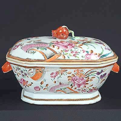 • <B>Sopeira </B>de forma retangular e cantos chanfrados em porcelana Companhia das Índias decorada em rica policromia nos esmaltes da Família Rosa com grandes botões floridos e pergaminhos. Pegas do bojo modeladas em cabeças de lebres e da tampa em romã. Séc. XVIII. Med. 21,5 x 33 x 23 cm
