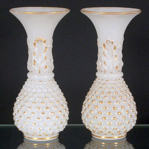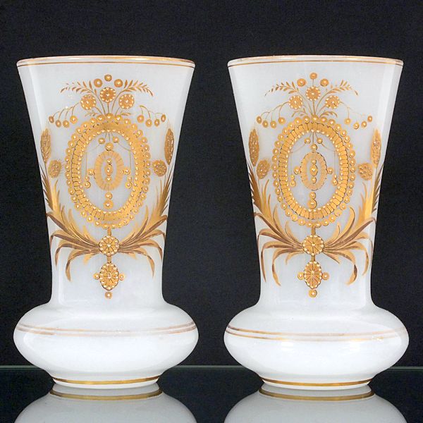 • <b>Par de vasos </b>franceses em opalina branco leitoso. Apresentam parte inferior bojuda decorada a ouro com elementos ovais em relevo. Haste com folha de palma e bocal de corneta filetado. Séc. XIX. Alt. 25 cm
