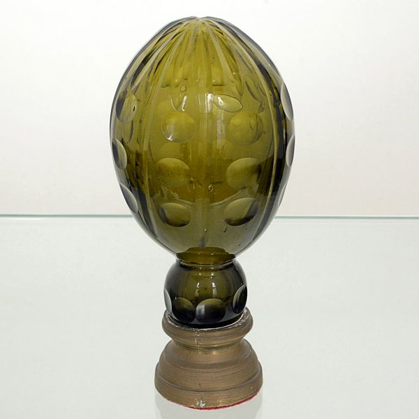 • <b>Pinha </b>ovoide em vidro cristalizado na cor verde garrafa. Lapidação em elementos geometrizados com estrelado ao topo. Base em bronze. Alt. 18 cm