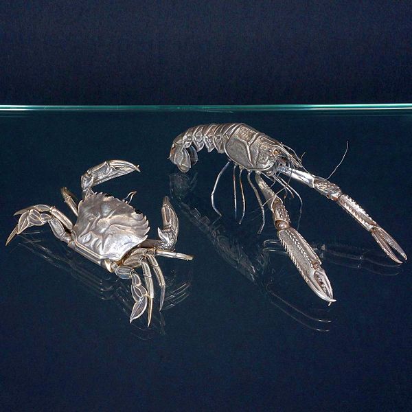 • <B>Conjunto de 2 crustáceos </B>composto por um lagostim e um caranguejo em prata espanhola articulada de excelente fatura. Olhos em contas (1 deles do lagostim, faltando). Peso 255 gramas.