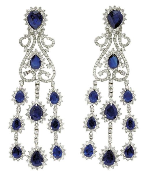 • <B>Par de brincos </B>em ouro branco 18k, pesando 22 gramas, com 484 brilhantes redondos totalizando 9,93 ct, mais 20 safiras totalizando 23,4 ct.