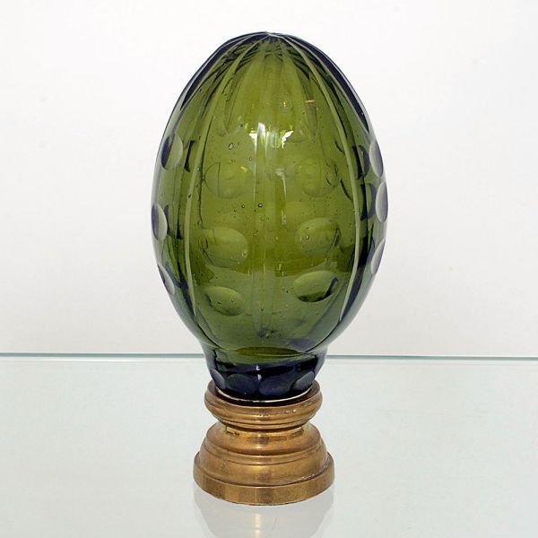 • <B>Pinha </B>decorativa em vidro verde, com superfície trabalhada em relevos ovais dispostos em linhas verticais. Corpo de forma alongada, assentado sobre base em latão de perfil escalonado. Alt. 19 cm