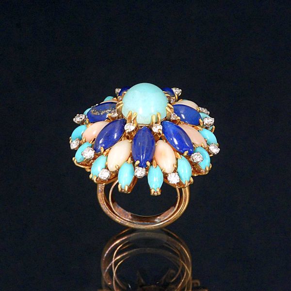 • <b>Anel </b>criação de Lucien Finkelsteinn montado em ouro 18k com 15 turquesas e 7 lápis lazúlis e 20 brilhantes redondos "full brilliant cut", 7 corais brancos. Peso total da peça 22,82 gramas.