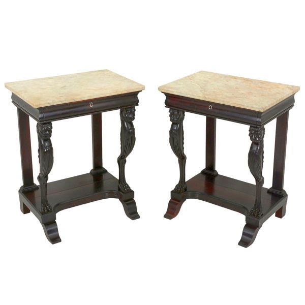 • <B>Par de consoles </B>Império, retangulares, em jacarandá escurecido. Tampos em mármore de Carrara com borda boleada sobre gaveta assentada em montantes, sendo os anteriores entalhados em carrancas de leões com volutas e belas patas. Montantes posteriores em traves retas e "plateau" inferior com frente escavada. Pés ondulados. Séc. XIX. Med. 79 x 63 x 45 cm
