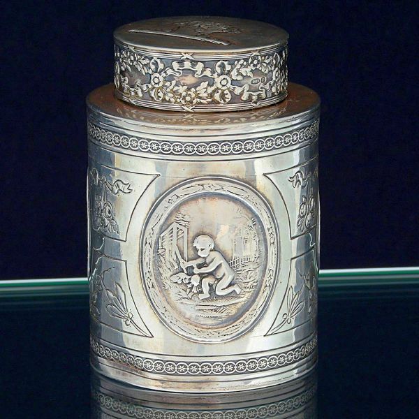 • "<b>Tea-caddy</b>" cilíndrico em prata francesa 915 ml. Decoração com figuras infantis e edificações inserida em medalhões ovais e restante em arranjos de flores. Apresenta contrastes indefinidos, um possivelmente de Paris (1684-1687) e outros provavelmente recentes. Alt. 9,5 cm. Peso 150 gramas.