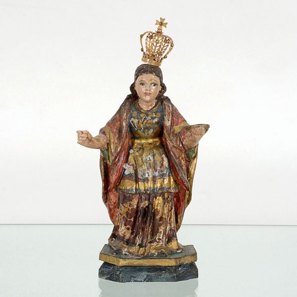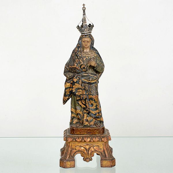 • Imagem de <B>Nossa Sra. da Conceição </B>em madeira. Apresenta vestes plissadas com sobremanto movimentado. Policromia em preto e dourado com volutas e arabescos. Pedestal dourado decorado com volutas e acantos. Coroa em prata. Séc. XIX. Alt. 30,5 cm sem a coroa