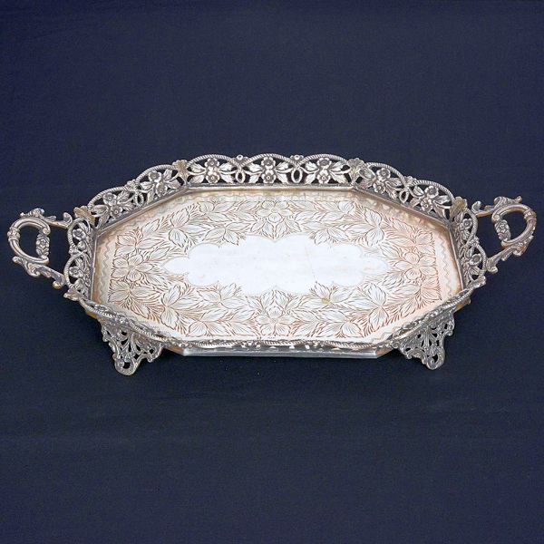 • <B>Bandeja </B>octogonal em prata portuguesa com fundo lavrado e aba em chanfrados vazados e floridos. Pés no estilo. Contraste da cidade do Porto de meados do séc. XIX e marcas de prateiro. Med. 40,5 x 24 cm. Peso 3160 gramas.