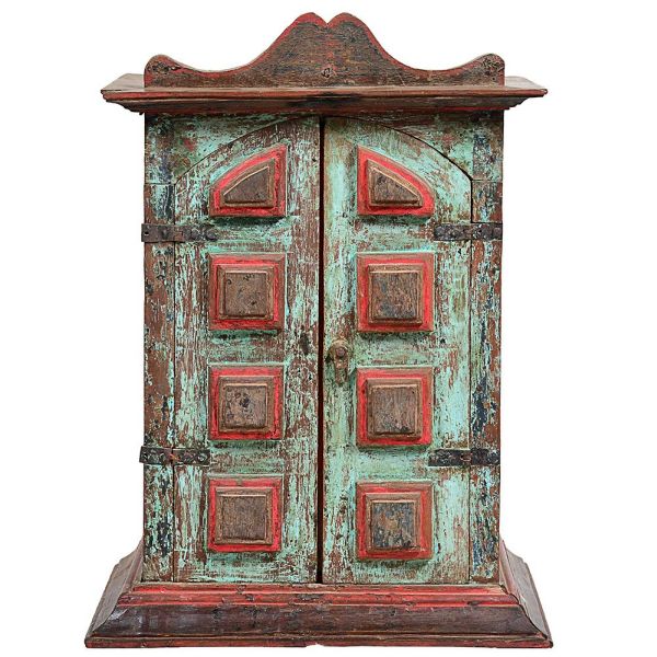 • <B>Oratório </B>colonial brasileiro em madeira patinada em tonalidade de verde e vermelho. Entalhe movimentado ao topo e portas almofadadas com peanha no interior. Ferragens da época. Séc. XVIII. Med. 71 x 52 x 26 cm