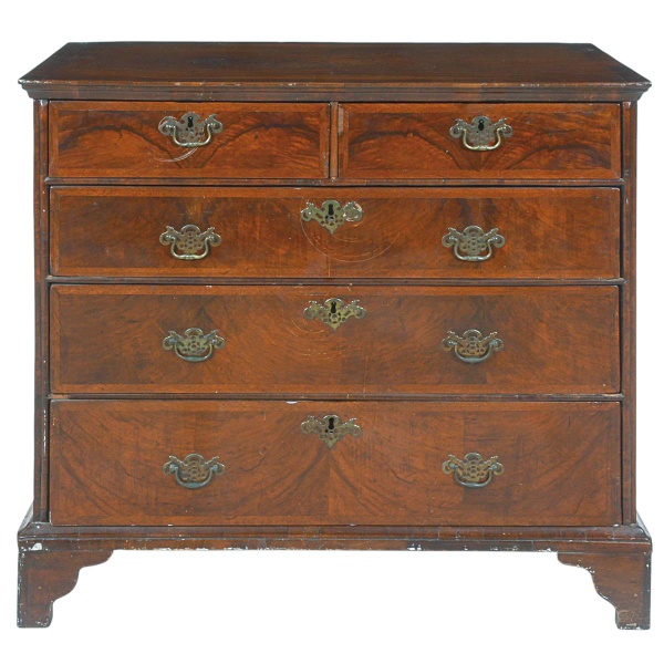 • <B>Cômoda </B>inglesa georgiana em madeira nobre, apresentando caixa retangular com duas gavetas lado a lado sobre três gavetões. Puxadores em bronze de época. Segunda metade do séc. XVIII. Med. 91 x 100 x 54,5 cm