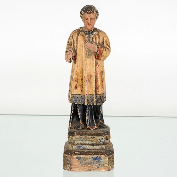 • Imagem de <B>coroinha de altar </B>em madeira, caracterizada por pátina preta com sobrepeliz patinada em bege debelada em azul. Vestimentas exatamente usadas por coroinhas em missas tradicionais. Séc. XIX. Alt. 21,5 cm