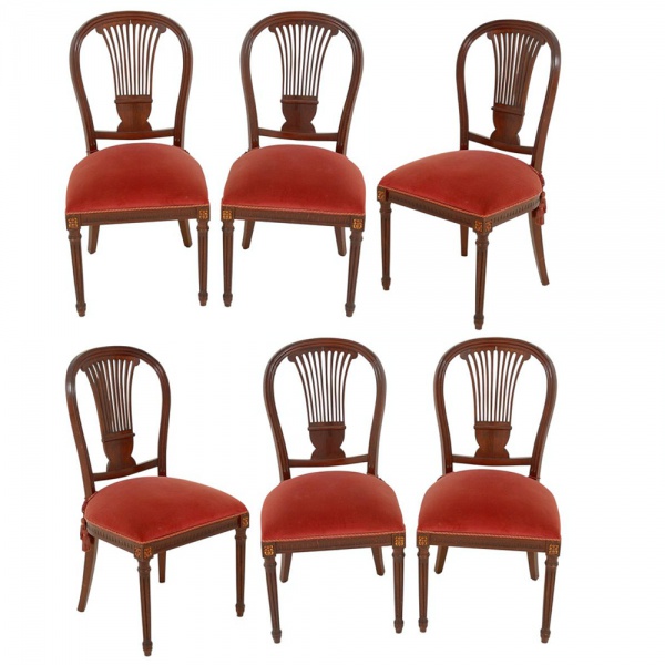 • <B>Conjunto de 6 antigas cadeiras </B>em mogno, apresentando espaldar recurvado com haste central decorada com varetas vazadas, pernas retas caneladas e frisadas e assento em veludo na cor goiaba.