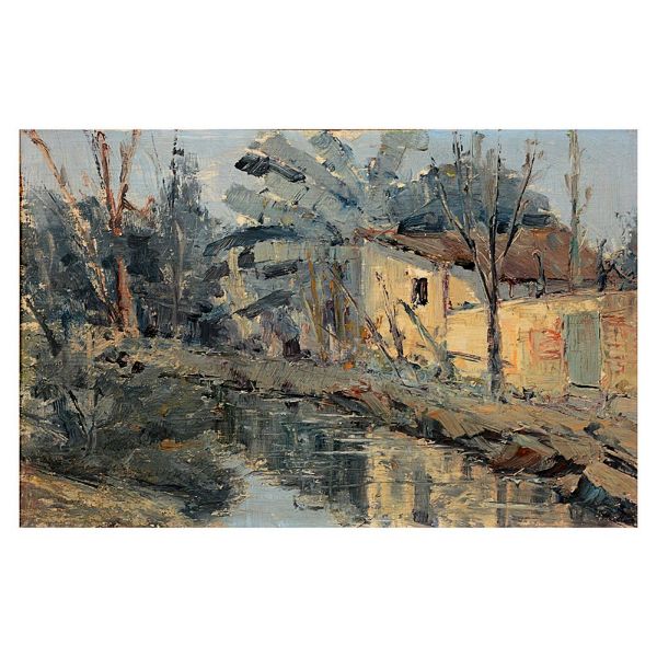 • <B>KAMINAGAI, TADASHI</B><BR>(1899-1982)<BR>Paisagem com Rio<BR>Óleo s/ madeira<BR>Ass. e datado 59, cie<BR>27 x 41 cm